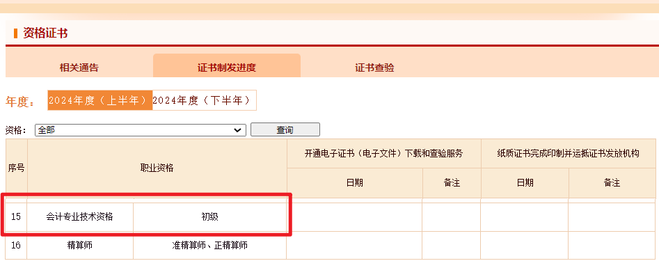 第三步,序号15为初级会计证书制发进度,目前为止2024初级会计电子证书和纸质证书的发放皆未确定时间。